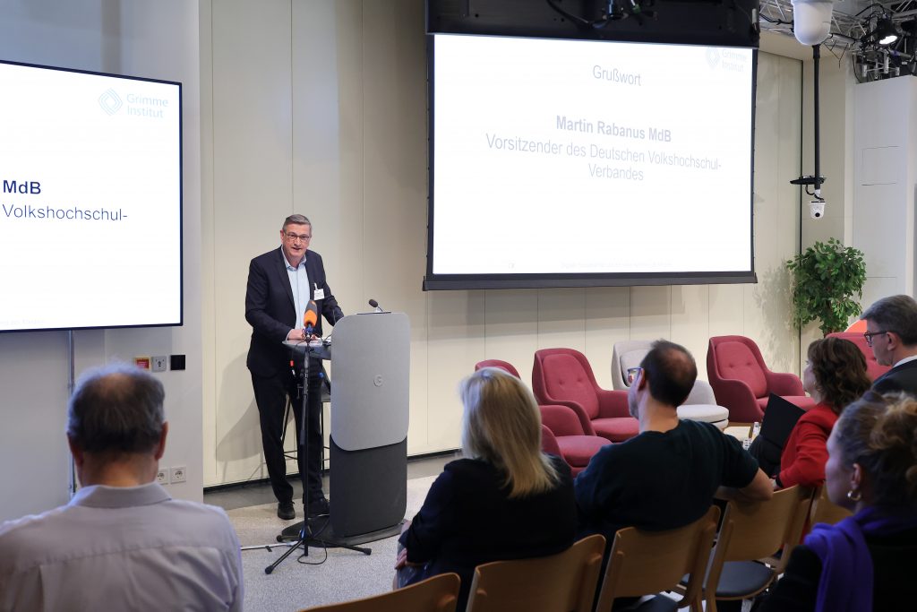 Die aktuellen Entwicklungen in der Medienwelt erscheinen uns umwälzend, aber dies ist nur der Anfang. Eine große Rolle wird KI in den Medien spielen, damit müssen wir uns auseinandersetzen. Und bei allem Optimismus: Es haben sich Informations- und Diskursformen entwickelt, die nicht mehr auf einer gemeinsamen gesellschaftlichen Basis funktionieren. Um dies konstruktiv zu begleiten, bedarf es gemeinsamer Anstrengungen aller politischen, wirtschaftlichen und zivilgesellschaftlichen Akteure – mit einem besonderen Blick auf die Medienschaffenden. Ich freue mich, dass auch das Grimme Institut, dessen Gesellschafter der DVV ist, in diesem Prozess eine Rolle übernehmen und ihn mit seiner Expertise – Stärkung der Medienqualität – unterstützen wird: durch Monitoring, Vernetzung und Evaluation. Die heutige Veranstaltung ist ein Beispiel dafür.